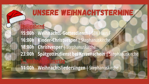Wir beginnen Heiligabend um 15:00h mit einem Weihnachts-Gottesdienst in unserem Raum im Erdgeschoss links von Haus F auf dem SBK-Gelände, zu dem Pfarrer Uwe Rescheleit herzlich einlädt.